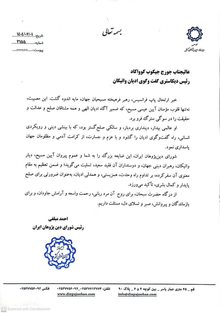 شورای دینپژوهان ایران، این ضایعه بزرگ را به شما و عموم پیروان آیین مسیح، دیار واتیکان، رهبران دینی جهان، و دوستداران آن فقید سعید، تسلیت میگوید؛ و ضمن تعظیم به مقام معنوی آن سفرکرده، بر تداوم راه وحدت، همزیستی، و همدلی ادیان، بهعنوان ضرورتی برای صلح پایدار و کمال بشری، تأکید میورزد.