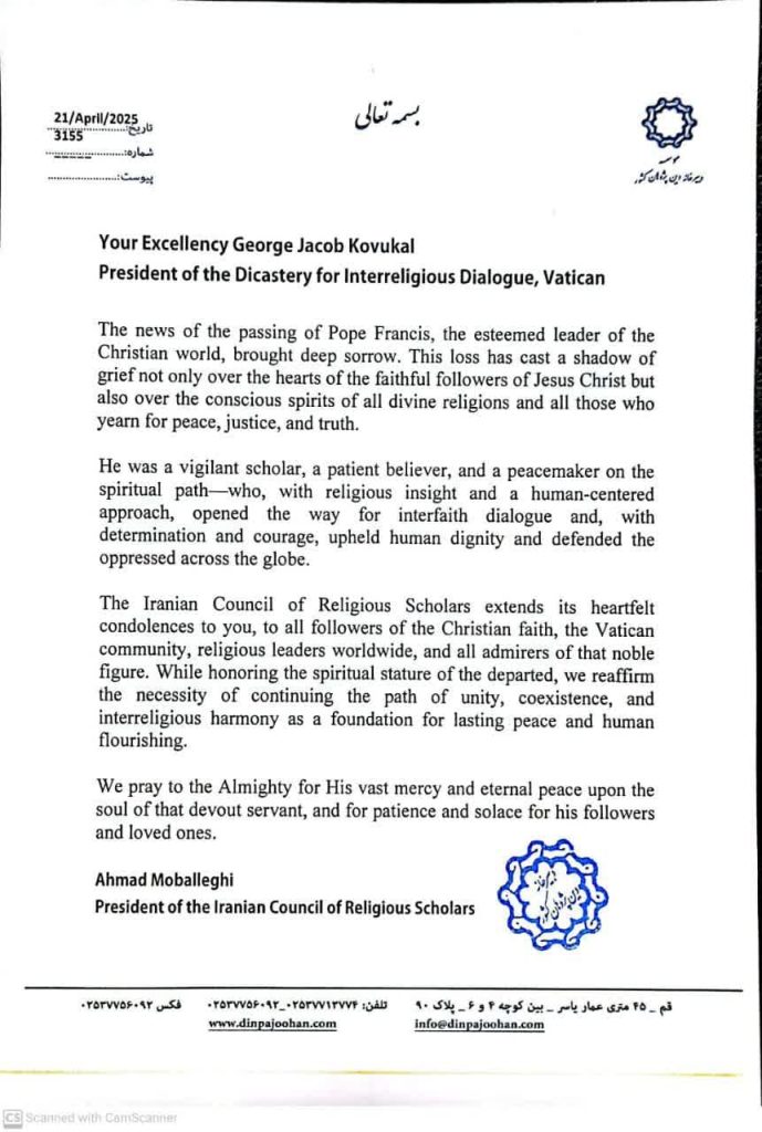 The Iranian Council of Religious Scholars extends its heartfelt condolences to you, to all followers of the Christian faith, the Vatican community, religious leaders worldwide, and all admirers of that noble figure. While honoring the spiritual stature of the departed, we reaffirm the necessity of continuing the path of unity, coexistence, and interreligious harmony as a foundation for lasting peace and human flourishing.